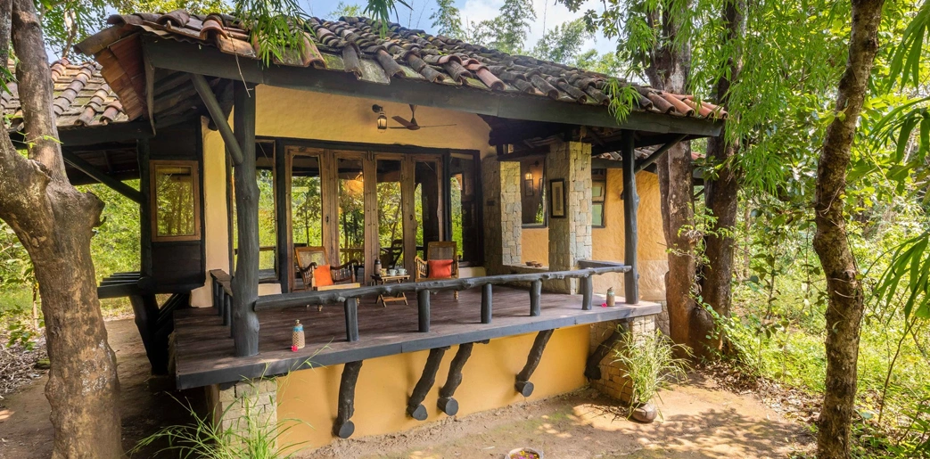 Kanha Earth Lodge is a luxurious stay option near the Kanha National Park. This property is built using local waste and recycled wood, and it clearly reflects a natural charm that perfectly matches the spirit of Kanha. This resort has 12 bungalows where people can stay and relax near Kanha. All of them are beautifully designed, and every area of the resort looks aesthetic. All the bungalows come with spacious verandas where you can sit and see the amazing natural views of the surroundings. The bungalows are designed with comfort in mind, and they feature a cozy lounge corner by the window, a writing desk, elegant bathrooms with double vanities, air conditioning, and 24-hour power backup, along with all other modern amenities. There is a swimming pool where people can relax after he safaris, and even the guests can visit the reading room for some quiet time. You can watch amazing wildlife documentaries and relax in the lounge area. Dining at Kanha Earth Lodge is a treat in itself, as the restaurant serves fresh, multi-cuisine meals prepared from locally sourced ingredients. With amazing amenities, luxurious comfort, and aesthetic areas, this resort attracts people to come here and stay with the natural calm of Kanha.