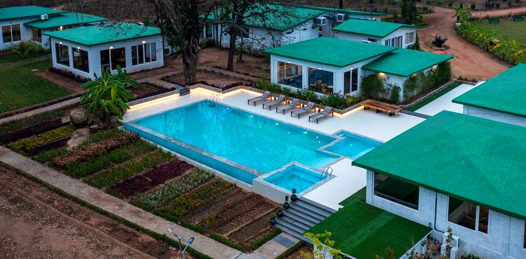The Riverwood Forest Retreat in Kanha is a beautiful property that offers tourists to stay and relax in natural surroundings. This resort features 18 cottages, and all of them are made with locally sourced materials. These cottages give a rustic yet comfortable staying experience and have a stylish appearance. The resort cottages have large glass windows that allow the guests to enjoy stunning views of the surrounding greenery. Also, the windows allow warm sunlight to fill the rooms during the morning, which creates a bright and refreshing atmosphere. The cottages are equipped with all modern facilities, such as LCD TVs, satellite channels, water heaters, bathtubs, mini-fridges, tea/coffee makers, and other essentials that make the stay both relaxing and convenient. To spend your free time at this resort, you can enjoy the spa services and get rejuvenating massages. Maybe take leisurely walks in the well-maintained garden area, or read books in the peaceful surroundings. The property’s architecture and layout are thoughtfully designed to provide aesthetic pleasure along with comfort. The staff of this resort is friendly, and you’ll feel at home while staying at the amazing Riverwood Forest Retreat in Kanha.